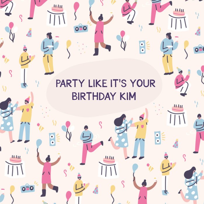 Leuke verjaardagskaart met illustraties en de tekst: Party like it's you birthday [naam]