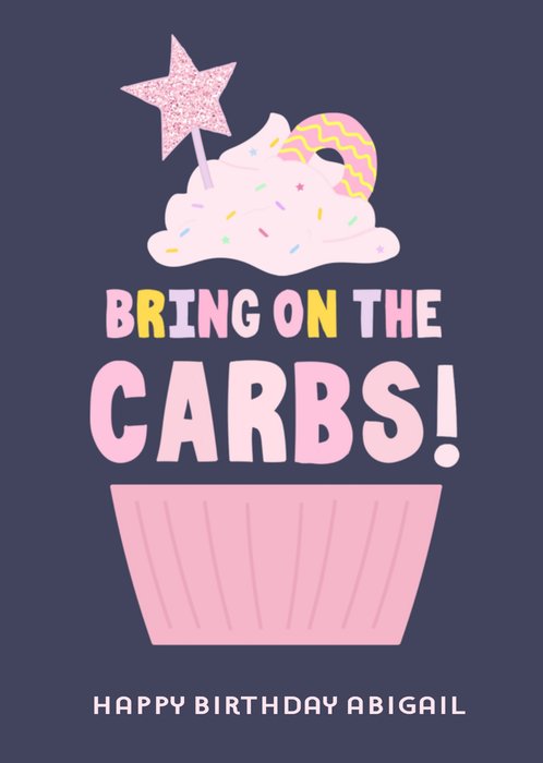 Leuke verjaardagskaart met een cupcake en de tekst: Bring on the carbs! Happy birthday [naam]