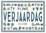 Leuke verjaardagskaart met verschillende illustraties en aanpasbare naam.