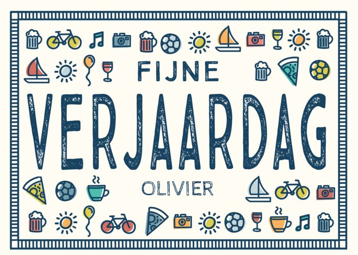 Leuke verjaardagskaart met verschillende illustraties en aanpasbare naam.