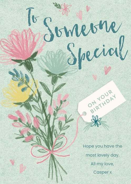 Leuke verjaardagskaart met een bos bloemen en aanpasbare tekst.