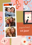 Kleurrijke verjaardagskaart met illustraties van bloemen, aanpasbare fotos en de tekst: 'Gefeliciteerd 16 jaar'. Verras de jarige met deze mooie verjaardagskaart van Greetz.