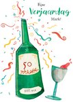 Leuke verjaardagskaart met een fles wijn met leeftijd en jaartal. Op de kaart staat: Fijne verjaardag Mark! De naam is aanpasbaar.