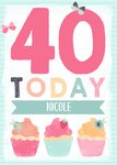 Verjaardagskaart met cupcakes en de tekst: 40 today Nicole. De naam is aanpasbaar.