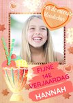 Kleurrijke verjaardagskaart met een lekker ijsje erop. Op de kaart staat: Voor de mooiste kleindochter. Fijne 14e verjaardag Hannah.