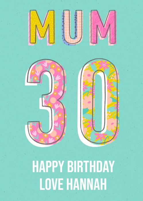 Kleurrijke verjaardagskaart met een grote 30 op de kaart. 'Mum 30 happy birthday love Hannah' is de tekst op de kaart.