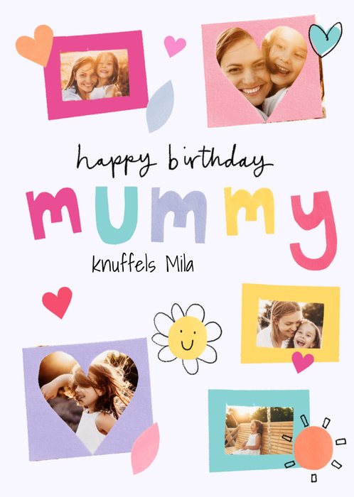 Kleurrijke verjaardagskaart met hartjes, aanpasbare fotos en de tekst: 'Happy Birthday Mummy'. Verras je mama met deze leuke verjaardagskaart van Moonpig.