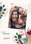 Wens een vriendin een fijne verjaardag toe met deze verjaardagskaart met verschillende bloemen erop. Op de kaart staat de tekst: Happy birthday my friend. Je kunt een eigen foto toevoegen.