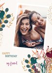 Wens een vriendin een fijne verjaardag toe met deze verjaardagskaart met verschillende bloemen erop. Op de kaart staat de tekst: Happy birthday my friend. Je kunt een eigen foto toevoegen.