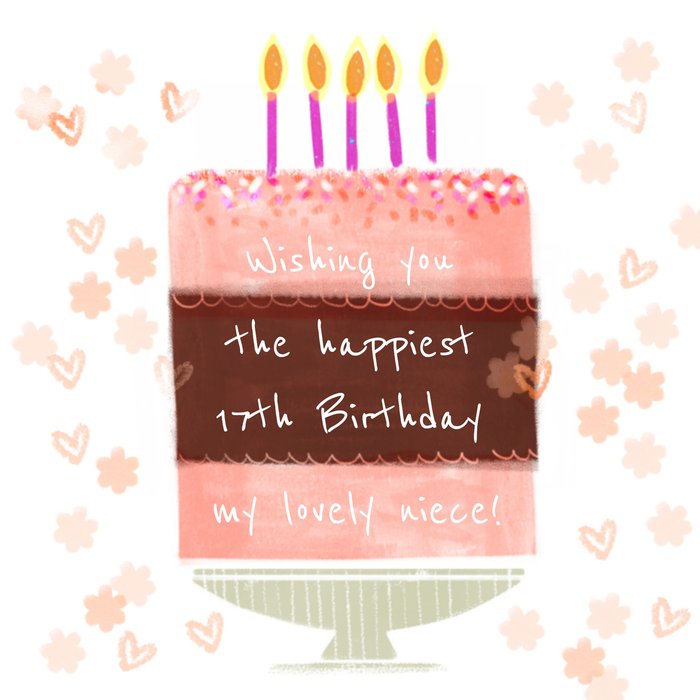 Lieve verjaardagskaart met een grote taart erop. Op de kaart staat: Wishing you the happiest 17th birthday my lovely niece!