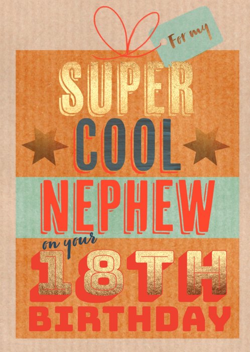 Vrolijke kaart met een cadeau en de tekst: For my super cool nephew on your 18th birthday.