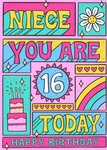 Kleurrijke kaart met de tekst: Niece you are 16 today happy birthday.