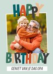 Kleurrijke verjaardagskaart met aanpasbare foto en de tekst: 'Happy Birthday'. Verras je Opa met deze leuke verjaardagskaart van Moonpig.