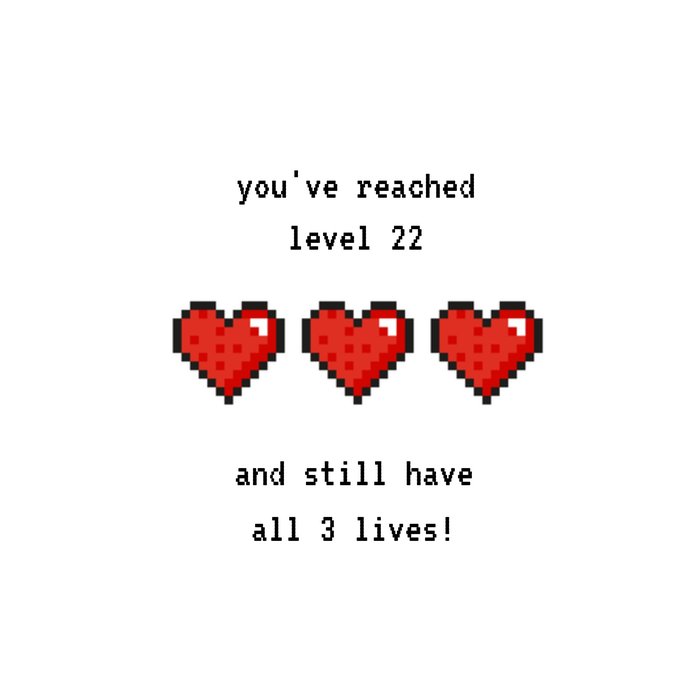 Leuke kaart met pixel illustratie en de tekst: You've reached level 22 and still have al 3 lives!