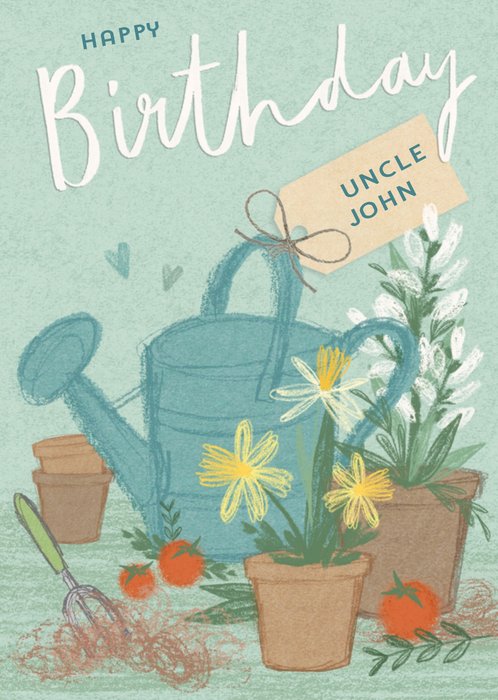 Mooie verjaardagskaart met planten, bloemen en een gieter erop. Op de kaart staat: Happy birthday uncle John.