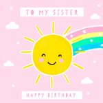 Kleurrijke verjaardagskaart met een roze lucht en daarop een zon en regenboog. Op de kaart staat: To my sister happy birthday.
