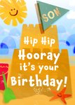 Vrolijke kaart met een zandkasteel en de tekst: Hip hip Hooray it's your Birthday! Op het vlaggetje staat: Son