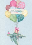 Lieve verjaardagskaart met een schildpad met ballonnen en aanpasbare naam.