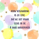 Ken je iemand die dit jaar wéér niet zijn/haar verjaardag kan vieren omdat het geen schrikkeljaar is? Verras met deze leuke verjaardagskaart. Op de kaart staat: Jouw verjaardag is zo epic dat we het maar eens in de 4 jaar aankunnen.