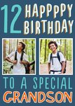 Leuke verjaardagskaart met de mogelijkheid om een eigen foto's toe te voegen. Op de kaart staat: 12 happppy birthday to a special grandson.