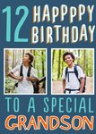 Leuke verjaardagskaart met de mogelijkheid om een eigen foto's toe te voegen. Op de kaart staat: 12 happppy birthday to a special grandson.