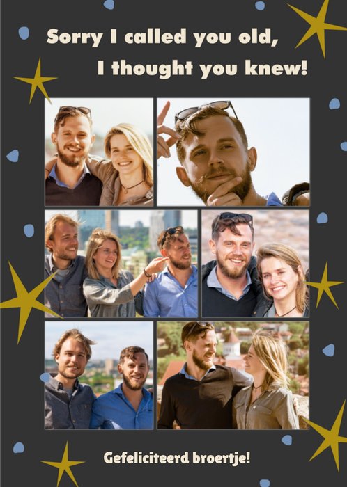 Kleurrijke verjaardagskaart met sterren, stippen, aanpasbare fotos en de tekst 'Sorry I called you old, I thought you knew!'. Verras je broer met deze leuke kaart van Greetz.