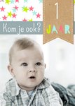 Trendy uitnodiging met sterren. Op de voorkant kan een eigen leeftijd en foto worden toegevoegd.
