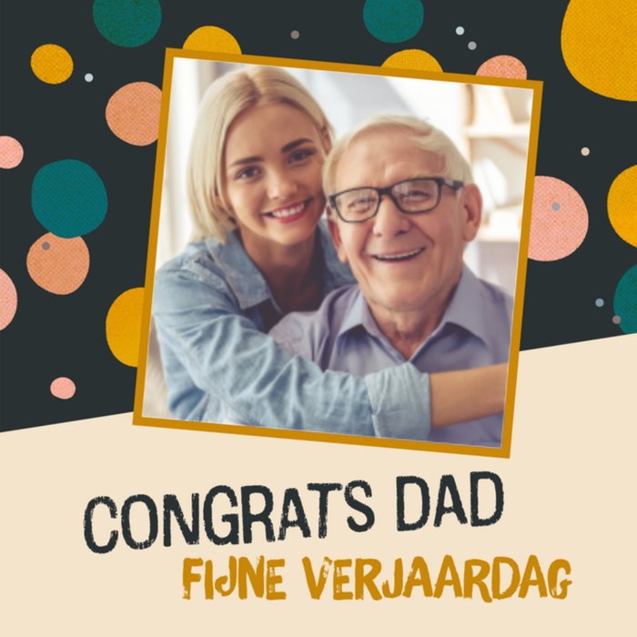 Het is binnenkort feest! Want jij kent iemand die jarig wordt. Stuur een kaartje om een glimlach op iemands gezicht te toveren. Op deze super leuke kaart van Greetz staat: Congrats dad, fijne verjaardag. Je kunt een foto toevoegen.