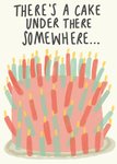 Grappige verjaardagskaart met een taart vol met kaarsjes en de tekst: There's a cake under there somewhere.