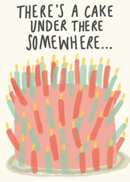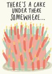 Grappige verjaardagskaart met een taart vol met kaarsjes en de tekst: There's a cake under there somewhere.