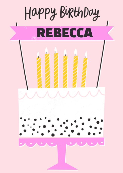 Vrolijke verjaardagskaart met taart en de tekst: Happy birthday Rebecca. De naam is aanpasbaar.