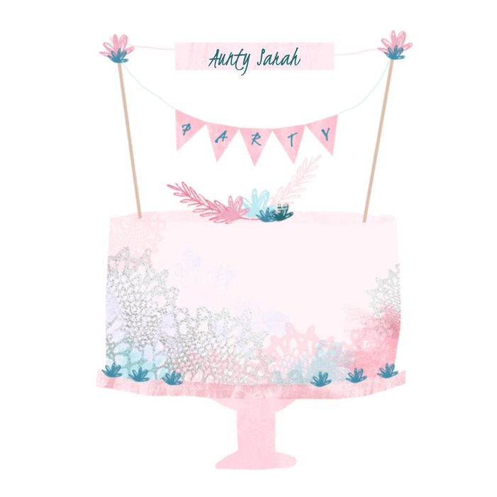 Leuke verjaardagskaart met een roze taart erop. Op de kaart staat: Aunty Sarah. Party. De naam op de kaart is aanpasbaar.