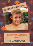Verjaardagskaart om je kleinzoon mee te verrassen. Op de kaart staat: Te gekke kleinzoon. Fijne verjaardag Ben 16 vandaag!