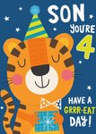 Leuke verjaardagskaart met een illustratie van een tijger die klaar is voor een feestje. Op de kaart staat: Son you're 4. Have a grrr-eat day!