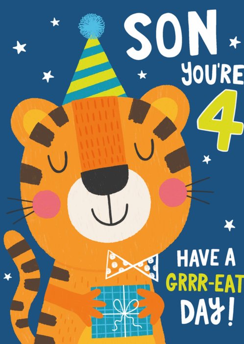 Leuke verjaardagskaart met een illustratie van een tijger die klaar is voor een feestje. Op de kaart staat: Son you're 4. Have a grrr-eat day!