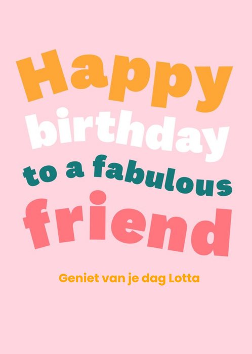 Typografische verjaardagskaart een roze achtergrond en de tekst: 'Happy birthday to a fabulous friend'. Verras iemand met deze kleurrijke verjaardagskaart van Moonpig.