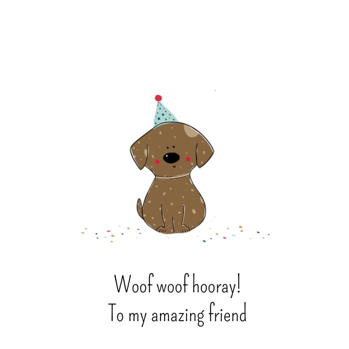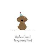 Feliciteer een vriendin met deze verjaardagskaart met een hondje op de kaart en tekst: Woof woof hooray to my amazing friend.