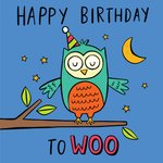 Grappige verjaardagskaart met een uiltje en de tekst: Happy birthday to woo