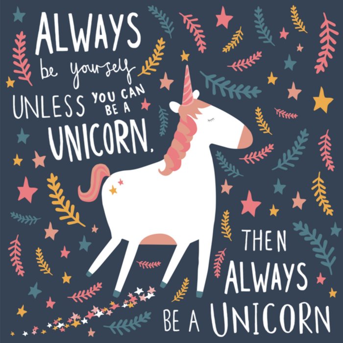 Leuke unicorn verjaardagskaart met de tekst: Always be yourself unless you can be a unicorn. Then always be a unicorn.
