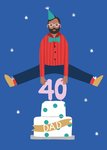 Grappige verjaardagskaart met een vader die over een taart heen springt met de tekst: 40 dad.