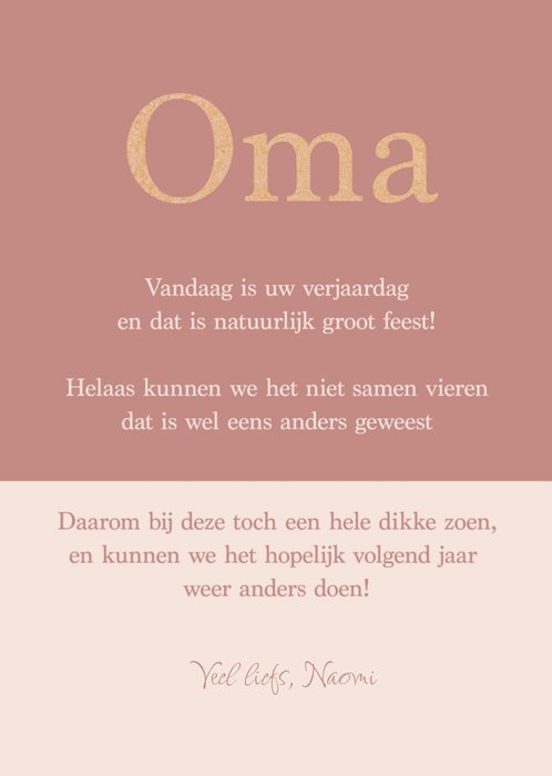 Feliciteer je oma voor haar verjaardag met deze verjaardagskaart. Op de kaart staat een mooie tekst voor je oma. De naam op de kaart is aanpasbaar.
