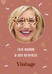 Wens een vriendin een fijne verjaardag toe met deze vrolijke verjaardagskaart met op de kaart de tekst: Lieve vriendin. Je bent nu officeel vintage. Je kunt een eigen foto toevoegen.