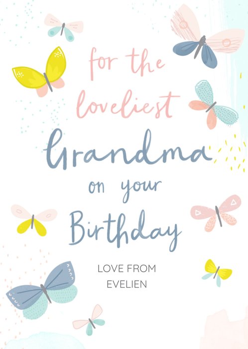 Mooie verjaardagskaart met de tekst: For the loveliest grandma on your birthday love from Evelien.