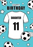 Coole verjaardagskaart met een voetbalshirt met daarop het getal 11 en voetballen erop. Op de kaart staat: Happy birthday daughter.