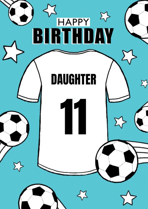 Coole verjaardagskaart met een voetbalshirt met daarop het getal 11 en voetballen erop. Op de kaart staat: Happy birthday daughter.