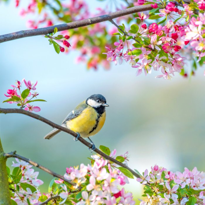 Mooie fotokaart van een vogeltje op een tak met bloesem.