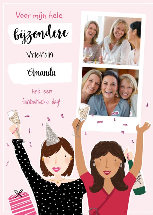 Jij kent iemand speciaal die binnenkort jarig is! Tijd om deze persoon dan te feliciteren met een leuke verjaardagskaart van Greetz! Op deze kaart staat: Voor mijn hele bijzondere vriendin [naam] Heb een fantastische dag! Je kunt meerdere foto's toevoegen.