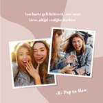 Minimalistische verjaardagskaart met een twee toon achtergrond, aanpasbare fotos en de tekst: 'Van harte gefeliciteerd voor onze lieve, altijd vrolijke dochter'. Verras je dochter met deze stijlvolle verjaardagskaart van Greetz.