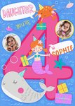 Vrolijke verjaardagskaart voor een lieve dochter die 4 jaar is geworden. Op de kaart staat Daughter you're 4 hi Sophie. De naam en foto's zijn aanpasbaar.