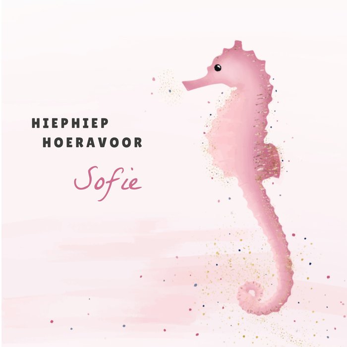 Verjaardagskaart met roze achtergrond en een zeepaardje erop met de tekst: Hiep hiep hoera voor Sofie. De naam kun je aanpassen.